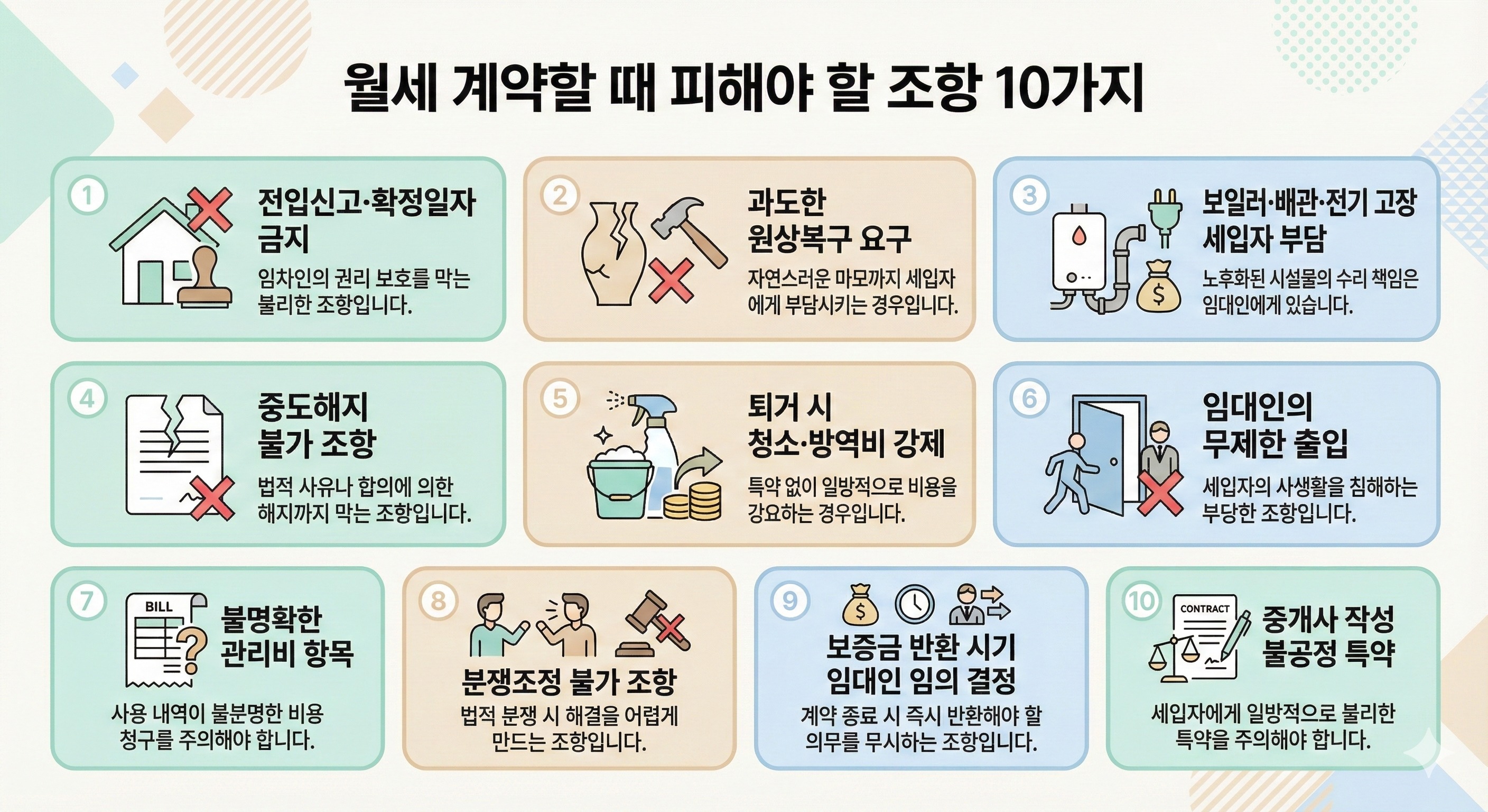 아래는 실제 분쟁 사례와 판례 기준을 반영해 정리한 월세 계약 시 피해야 할 위험 조항 10가지이다.